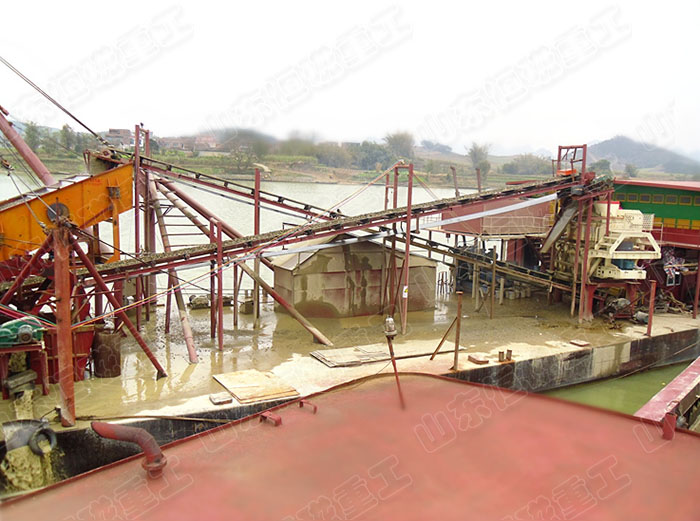挖沙選鐵船由浮體、鏈鬥挖沙係統、篩分係統、磁選係統、尾沙排除係統、動力係統組成。首先,河道裏有水,榴莲视频官网下载的選礦設備必須要浮在水麵上工作,因此榴莲视频官网下载用3.5-4毫米的鋼板做成了浮體,根據挖沙深度的不同,浮體的寬度和長度都有相應的尺寸要求,一般寬度在1.5-2米之間,長度在16-32米之間。另外,增加船的穩定性,兩個浮體之間間隔了一定的距離,一般為1.5米左右。顧名思義,這套選礦設備的上料係統是鏈鬥式的挖沙係統,河沙由鏈鬥提上來以後,因為有大小不一的石子,為了保護磁選機的安全,必須經過篩分係統。根據河道的環境不同,一般來說,石子比較少、直徑比較小的河道用自震式比較好,維修方便,節省動力(約5KW)。