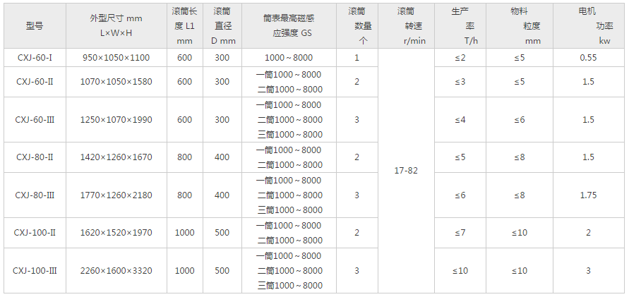 CXJ型筒式榴莲视频成人APP(從單筒到三筒)是一種從幹性粉料中連續自動除鐵的磁選設備其內部采用獨特的磁路設計,由高性能永磁王釹鐵硼材料作為磁源,磁場強、吸力大、除鐵率高,入料方式采用我公司勻速振動給料裝置,入料均勻,更利於進入磁選區後的分離。具有免維護、節約能源、使用可靠等特點,可調整控製進料量,適用於不同顆粒的要求。