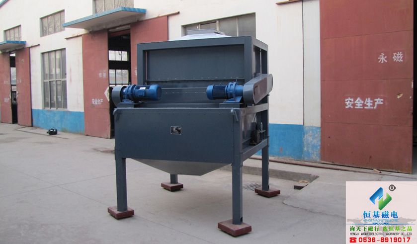 其運行原理是物料經料倉落入勻速給料裝置,通過給料裝置將物料在沒有進入磁選區之前,用振動的方式對物料和磁性物質通過重力和振動,使粘連或包裹的磁性物質基本實現分散狀態。並能夠均勻的送到磁選區域,在設備的磁選區受到重力和磁場力的作用下,利用物料的磁性差異有不同的運動軌跡實現分離,磁性礦物被吸附在磁輥表麵旋轉到達精礦區,毛刷將吸附在磁輥表麵上的磁性礦刷脫。