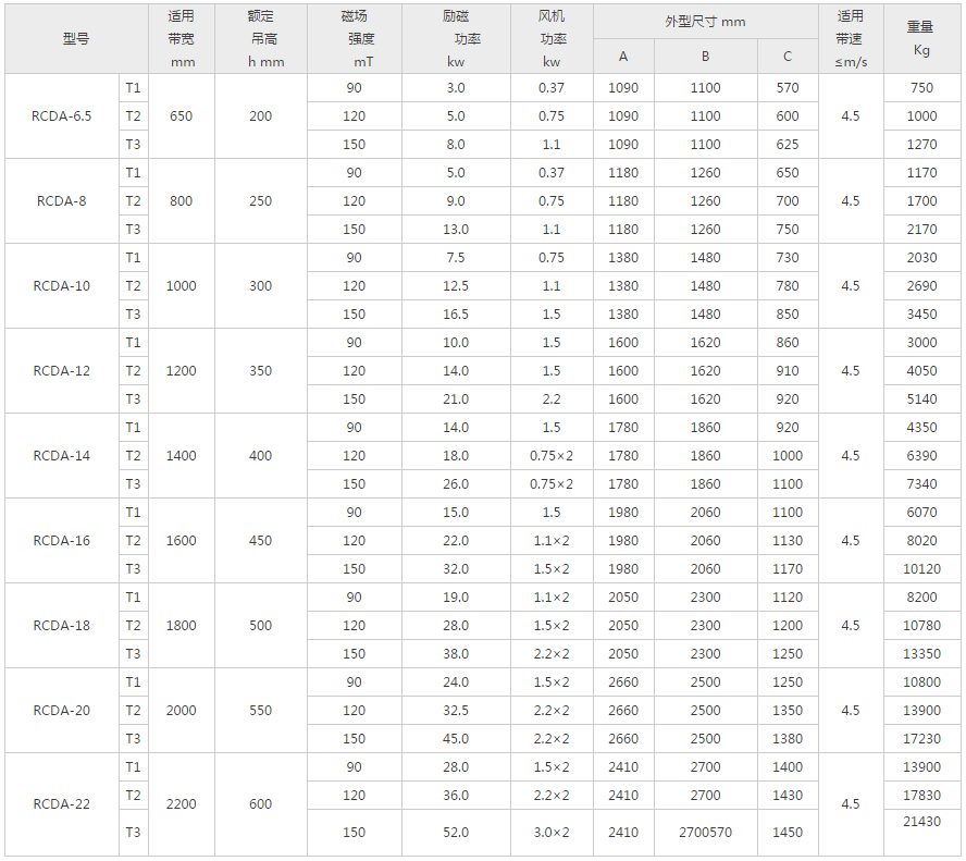 RCDA-T型超強風冷電磁榴莲视频毛片內部磁路設計獨特,透磁深,吸力大,吸力遠大於國標除鐵器。軸流式風機強迫風冷,風量大,使除鐵器散熱快、溫升低,保障除鐵器無故障長期工作。